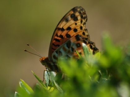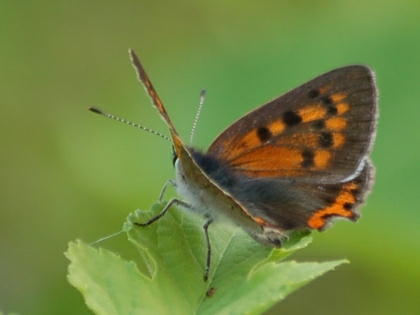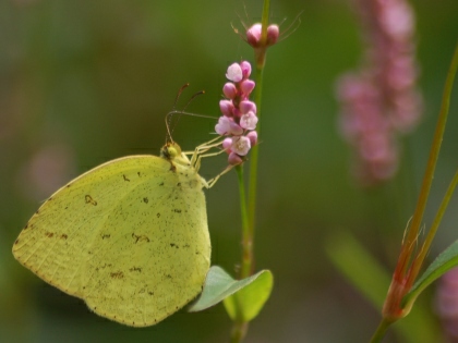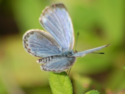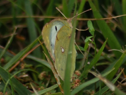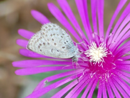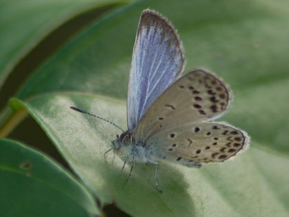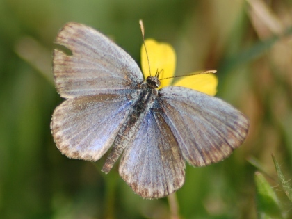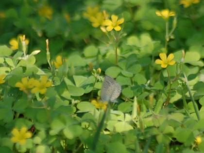 カタバミのお花畑です。 その周辺にいくつものヤマトシジミがとびかう姿が見られました。 ときに吸蜜する姿も。 ヤマトシジミは、その幼虫が、カタバミの葉をいただきながら大きくなるので、 カタバミとは、相性がよいのです。 カタバミのお花畑を目の前にして、しばらくじっと動かずにようすを見ていると、 目の前の花にとまって、翅を広げ、吸蜜している1頭のヤマトシジミが撮れました。 (撮影:2010.10.13 甲府市下曽根町・曽根丘陵公園にて)